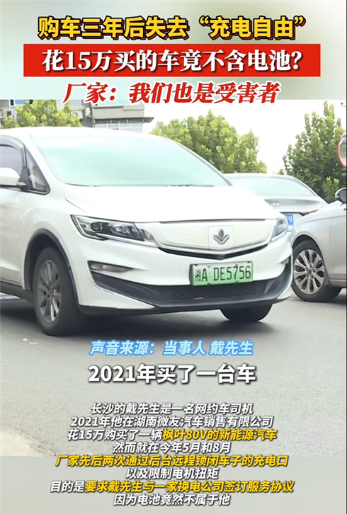 今年5月,正在工作中的戴先生突然发现,车辆无法正常充电了,经过检查了解后才了解到,厂家通过GPS远程锁闭了充电口。