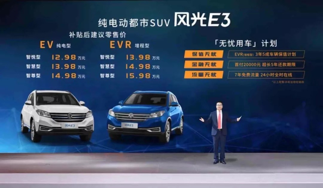 风光E3 EV(纯电型)上市价格区间为12.98-14.98万元,E3 EVR(增程型)上市价格区间为13.98-15.98万元,同时风光E3也推出了专属的“用户无忧计划”,包括东风风光E3 EVR(增程型)3年5成的车辆保值无忧;首付20000元,超长5年还款期的金融无忧;7年免费流量,24小时在线的流量无忧。