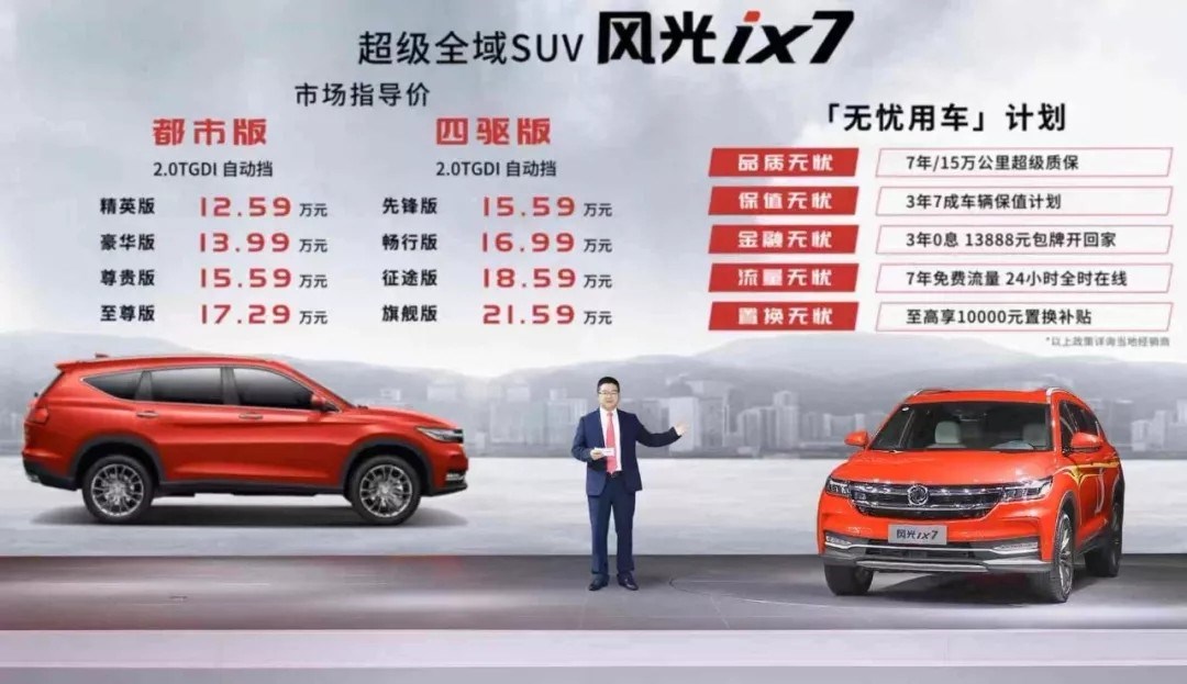 东风风光还发布了针对风光ix7的“用户无忧计划”,包括7年/15万公里超级质保的品质无忧;3年7成车辆保值无忧;3年0息,最低13888元包牌开回家的金融无忧;7年免费流量,24小时在线的流量无忧;购车时至高享10000元置换补贴的置换无忧,完全免除用户购车的后顾之忧,将“不贵”落到实处。