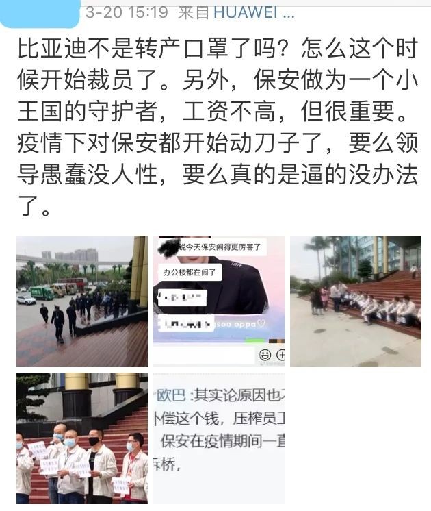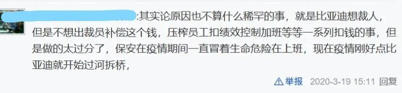 而比亚迪疫情复工复产后,就出现了员工维权,声讨公司并提出要诉求的事件,看来比亚迪内部管理与员工产生的矛盾确实存在,底层员工的利益受到损害,并在这次疫情中进一步爆发。