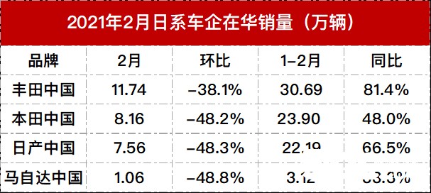 截止3月5日,包括丰田、本田、日产、马自达在内的四家日系车企已陆续公布在华最新月度来看。整体来看,四个日系品牌在华的销量表现基本相同,即2月份出现较大的环比下滑,但是1-2月份销量则出现较大的同比增长。