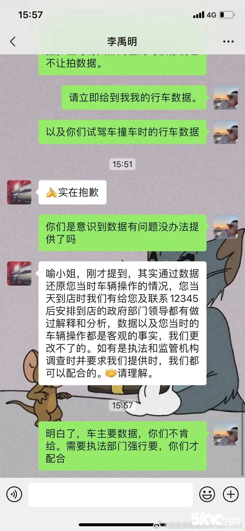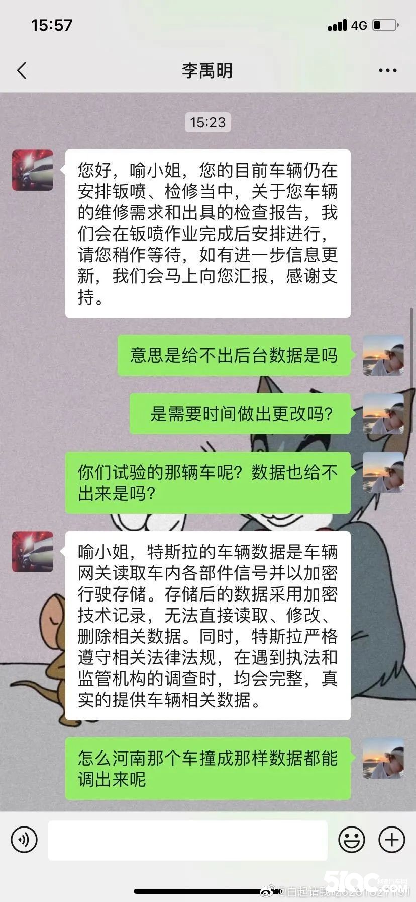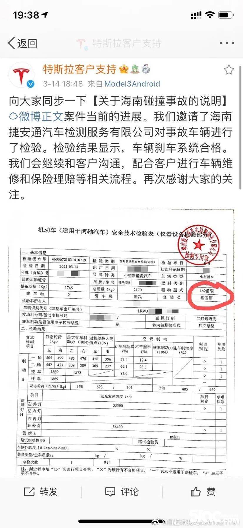 我不认可特斯拉对于311海南失控事件的说明,更不认可它单方做出的毫无专业性的检测报告。它的结论是全程未发现车辆存在故障,是基于它的后台数据显示。众所周知,特斯拉的后台数据从未公开过,只通过口头传达方式告知过有限的失控事件车主。这种既当裁判又当运动员的方式,无法让人相信其数据真实性。3月14日下午3时许,我问询了特斯拉海南店的售后李先生,他拒绝给出事发时数据。当提到为何河南车主张女士能要到口头传达的数据时,他竟然质疑这一客观事实。那么请问,特斯拉的数据政策为何存在地区差异?由车辆产生的数据是车主财产的一部分,特别是当发生事故时车主有权索要相关数据,以行使基本的知情权,可特斯拉为何百般阻挠?二、关于事故原因。特斯拉在说明中提到,现场存在“大量砂石”、“大量积水”,事故原因是地面湿滑和车主踩踏板较轻。这是可笑的。3月11日当天无雨,事发地为一工地的内部停车场,只有约2mX3m的一片积水,深度约3mm,尚不能没过鞋底,如何因为“大量积水”导致车辆失控? 另外它根本没有调查清楚:车主是我喻女士,但当时开车的是我朋友!他当时在轻踩刹车没反应后,立即重踩刹车,但刹车踏板已经异常僵硬,基本踩不动。一位年轻男士用力踩刹车,以15km/h的时速,竟然在30米内没有刹停,你告诉我是踩的太轻?3月13日,直播海南的记者来现场采访,他们驾驶一辆别克轿车以同样速度开过那个水坑,很稳的停住了。当时水坑因为渗漏原因比事发当天还要深一些,从视频中可以看出飞溅明显的水花。为什么别的车过更深的水坑能刹住,而Model 3却刹不住? 三、关于两次还原碰撞。3月11日下午,特斯拉店的石先生驾驶另一辆Model 3做了两次还原测试。第一次是持续踩刹车,能刹停;第二次先点刹再重踩刹车,结果同样飞出场地。 第二次事故,基本复原了我们上午的事故。但特斯拉不但没有解释原因,甚至在说明中丝毫没有提及。它只隐晦的提及第一次成功刹停。请问为何避重就轻?全网都在关注那个店员也撞车的视频,为何不做解释?我们的疑问是:为何在先点刹再重刹情况下,会导致Model 3在较湿滑路面失控? 这不是正常现象,请不要再请水军和亲特媒体洗地了。就连现场试车的售后石先生,在撞车后也惊讶的表示:还真有哦......最后他的试驾车也被拖走了。请问,如果连特斯拉工作人员都无法安全驾驶Model 3,它的安全性在哪里? 四、关于点刹。为何要点刹?因为我朋友右拐入场地后,想靠边停车。这时速度不高,还没到停车位,当然要轻带刹车。网上有人质疑说为什么不一下刹死,没到停车位为什么要刹死?还有人摆出ABS说明书。那页说明的第一句是“在紧急情况下”,当时场地很空,时速不到20km,第一刹车点没有水坑,这算什么紧急情况?就算ABS不起作用,就算路面较湿滑,你能解释20km/h时速30米刹不住?如果Model 3娇气到有一点湿滑就刹车失灵,那谁还敢开特斯拉的车?整个说明回避了一个重要问题:刹车踏板为什么突然变硬且踩不动?请特斯拉正面回答。五、为什么删我数据?出事后,保险理赔员很快赶到现场,他提醒说:快看一下行车记录仪。结果我们惊呆了:只有08:52-53那一小段出事时的数据没有了,而之前的数据都在。我们质问特斯拉工作人员,第一次告诉我们是因为没有摁喇叭,所以没有保存。我们说那为什么在进场前的数据还有?那时也没有摁喇叭。他们改口称,可能是数据写满了,自动覆盖了。你说巧不巧?数据早不覆盖晚不覆盖,恰巧把出事的那两分钟覆盖了!特斯拉,你正面回答:我的行车记录仪数据去哪里了?你们不给后台数据就算了,为何还要删除我们车上的数据?你们到底想遮掩什么?!12:24,海南省新能源汽车促进中心的钟主任打来电话,说非常重视此事,他会要求特斯拉送去第三方做检测。如果不满意,再换一家第三方检测。如果海南不行,可以换到内地去检测。 15:23,特斯拉售后人员李先生在微信说:我的Model 3仍在安排钣喷、检修中。18:00,李先生在微信突然发来一份检测报告,说结果出来了:制动性能没有问题。我很震惊,追问车辆不是下午还在检修吗?怎么一下检测报告都出来了?车子到底什么时候送检的?李先生一会说“车辆一早安排了送检,钣金维修只进行到一半。”一会儿说“早上11点多安排车辆去送检,18:00左右车子返回服务中心。”可下午3点多,不是还说车子在“安排钣喷、检修中”吗? 那么,车子到底什么时候送检的?下午3点多车子是在检测还是在钣喷?以上信息都有截图为证,请问特斯拉工作人员的话有几句是真的? 而且,这场“袭击式”检测为什么不通知车主?甚至开始检测了也不告诉车主?直到最后才甩给车主一份报告单?特斯拉这种“先斩后奏”的闪电式检测,到底想干什么?重点是,这份当天送检、当天出结果的检测报告有什么不可告人的秘密呢?请问特斯拉,如果这份报告是权威的,那么我将申请退一赔三。因为你们历史上从未生产过一款前驱车,但却卖给我一款前驱车,明显货不对板,涉嫌合同欺诈!如果这份报告不权威,那么你偷偷摸摸、匆匆忙忙做出来并发到微博上公示是几个意思?只是为了交差,赶在315前给我一个交代?对不起,我不接受! 另外,我们致电该公司后,得到如下信息:捷安通只是一家普通的年检公司,主要流程是在台架上检测出车轮的制动力,和车重算出比值后≥60%就算合格。整个过程快的话不到半小时就做完