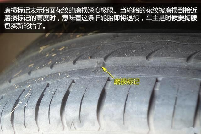 每个轮胎都有磨损标记,当轮胎磨损到磨损标记时,即轮胎胎面花纹深度低于2mm时,就需要更换轮胎。此时轮胎的排水性能下降,雨天行驶危险系数增大,即使在干地,也可能因为胎面过薄引起爆胎。