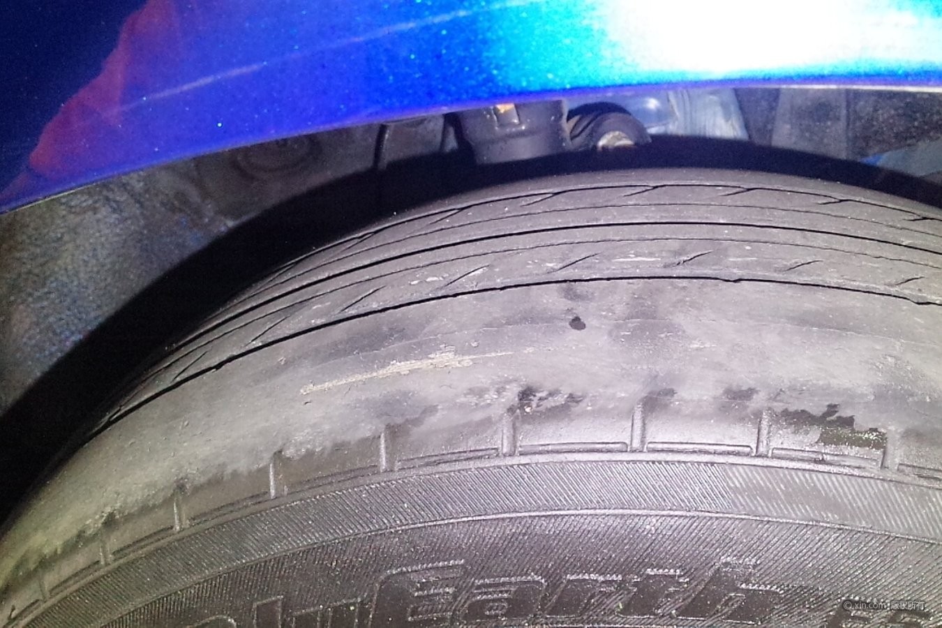 5. 胎壁被扎: 胎壁被扎的确比胎面受伤更危险,如果受损处位于标识下侧靠近轮毂边缘,此时轮胎必须更换,因为此处钢丝强度很弱,并且修补后在装胎过程中此处必然会受到挤压变形,很难保证修补效果。