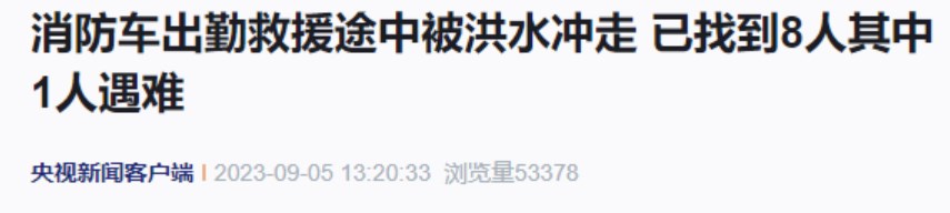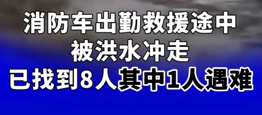 据福建福州永泰县防汛抗旱指挥部消息:2023年9月5日4时15分许,福州市永泰县消防大队一辆消防车出勤救援途中,在塘前乡赤鲤村被洪水冲走,车载9人。据前方救援人员最新消息:截至下午1时,已找到8人。还有1人正在搜救中。找到的8人中有1人不幸遇难。