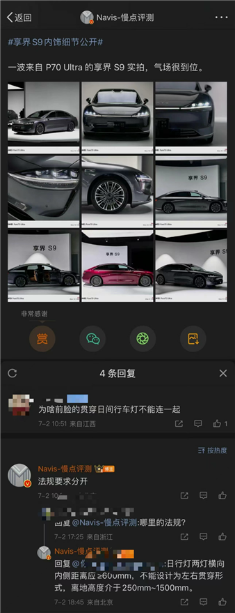 起因是,博主“慢点评测”发布了一条享界S9的实拍图分享博,下方一条评论问到:“为何S9的贯穿日间行车灯不能连在一起?”
