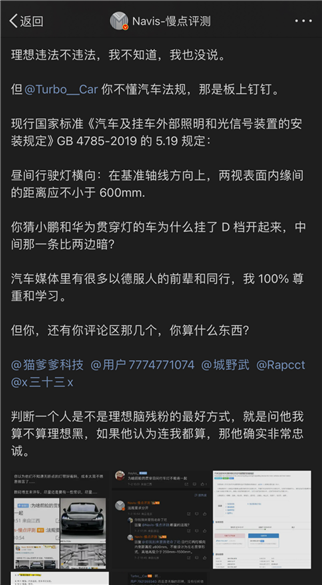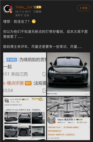 该博主截图发博说“慢点评测”是在说理想的灯违法,替理想汽车对号入座。并直指包括享界在内的其他车不做无断点灯带,是因为成本太高不想做罢了。潜台词是理想非但不违法,而且还很肯下本。