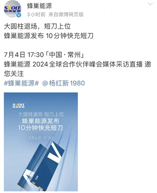 7月4日,蜂巢能源发布了10分钟快充短刀产品。与此同时,蜂巢能源还发布了5C磷酸铁锂短刀电芯,10-80%充电时间缩短至10分钟,以及6C三元超充电芯等多项技术,以此提升续航与超充体验,并适配混动、纯电等不同动力形式的车型。