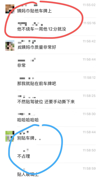 而此时,另一名群友建议她将姨妈巾,贴在对方车牌上,只要对方没绕车一周就发现不了,开出去就是一个12分扣光光。
