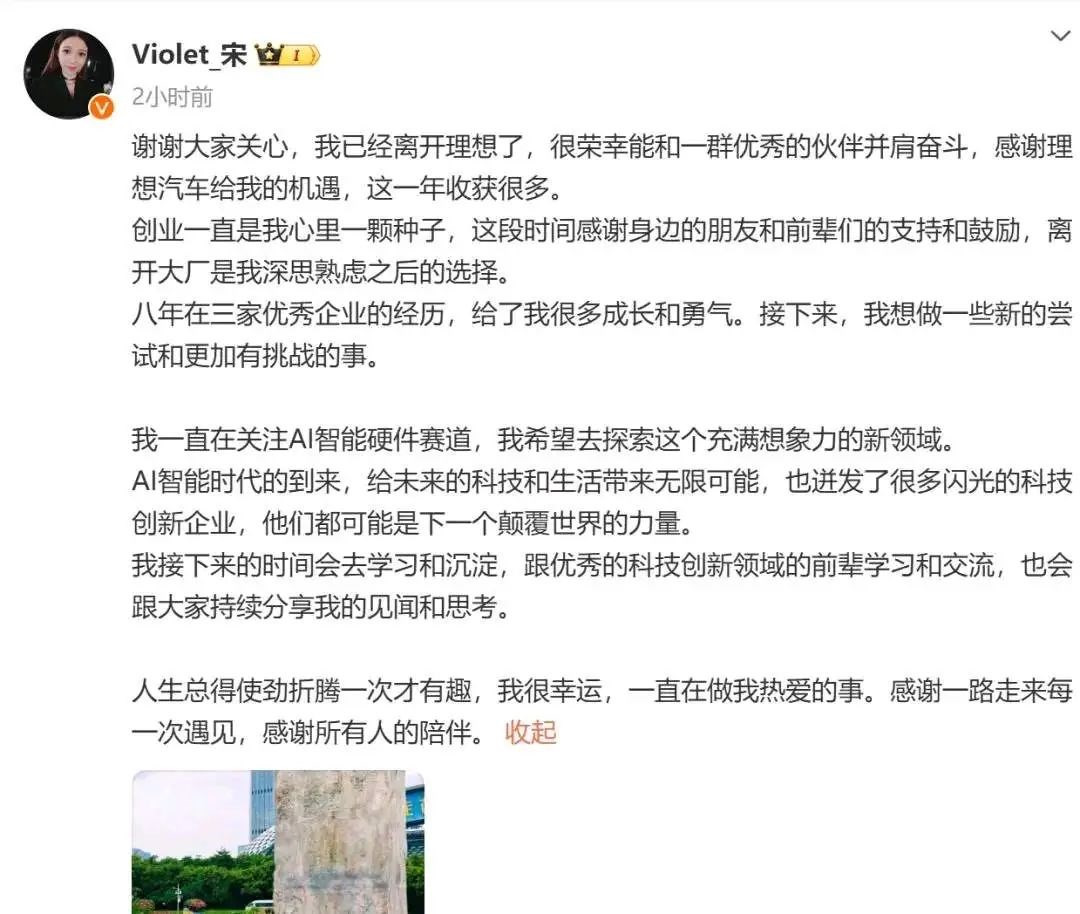 宋紫薇写道:“谢谢大家关心,我已经离开理想了,很荣幸能和一群优秀的伙伴并肩奋斗,感谢理想汽车给我的机遇,这一年收获很多。”