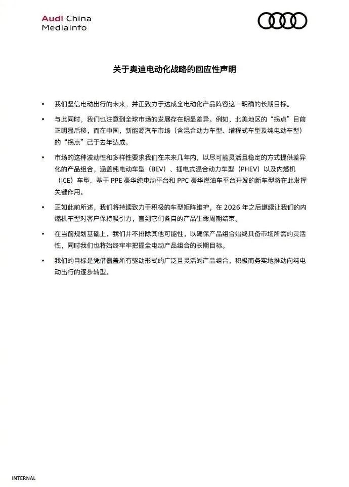 有报道称,德国车企奥迪调整了未来战略,取消了原定于2033年全面电动化的计划,未来10年将继续生产燃油车。对此,今日,奥迪发布《关于奥迪电动化战略的回应性声明》。声明中,奥迪表示,坚信电动出行的未来,并正致力于达成全电动化产品阵容这一明确的长期目标。但注意到全球市场的发展存在明显差异,比如北美地区的“拐点”目前正明显后移,而在中国新能源汽车市场(含混合动力车型、增程式车型及纯电动车型)的“拐点”已于去年达成。