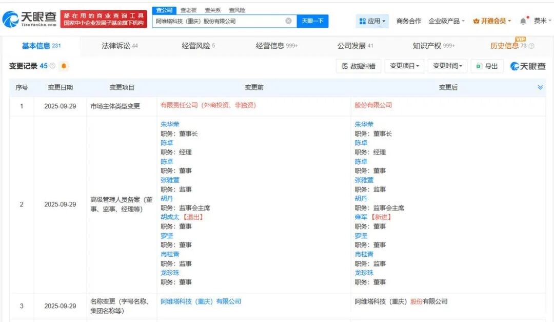 阿维塔科技(重庆)有限公司发生工商变更,企业名称变更为阿维塔科技(重庆)股份有限公司,同时发生高管变更。阿维塔科技(重庆)股份有限公司成立于2018年7月,法定代表人为陈卓,注册资本约30.7亿元。股东信息显示,该公司由长安汽车、宁德时代、南方工业资产管理有限责任公司等共同持股。