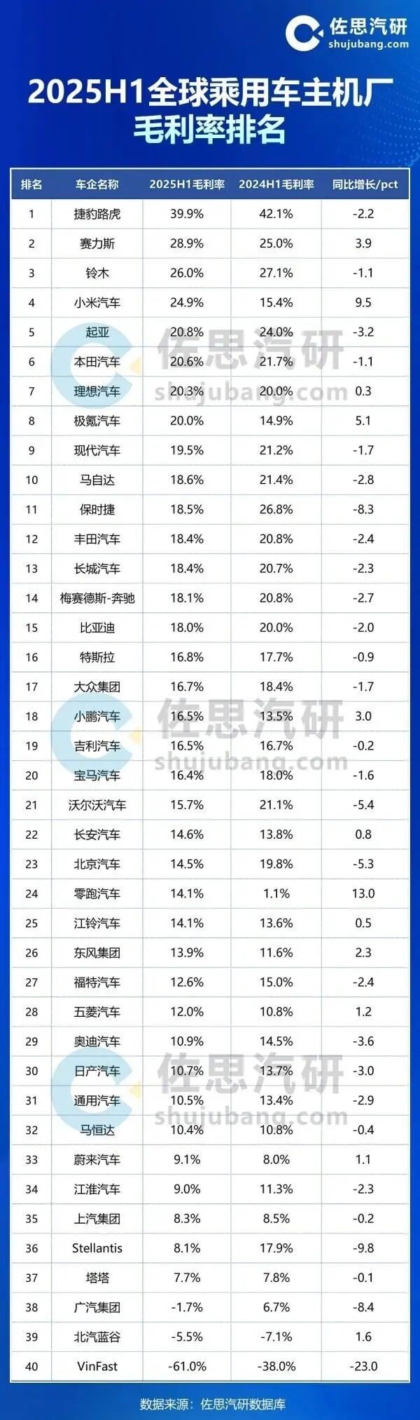 有机构发布了2025年上半年全球乘用车主机厂毛利率排名。毛利率取得正向增长的车企主要集中在中国,其中,赛力斯的毛利率为28.9%,是国内毛利率最高的车企;而零跑汽车毛利率同比增长13.0个百分点,是全球毛利率同比增长最快的车企。