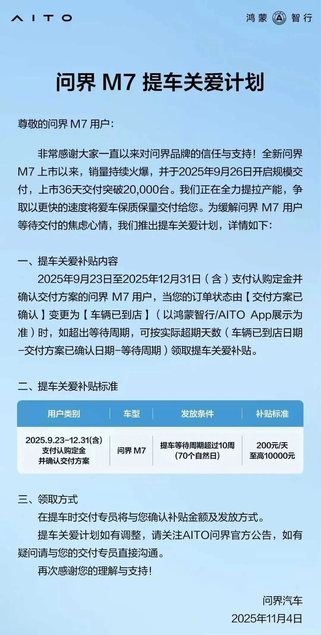 鸿蒙智行官方今日发布问界 M7 提车关爱计划,将为提车等待周期超过 10 周(70 个自然日)的用户每天发放200元补贴,至高补贴10000元。