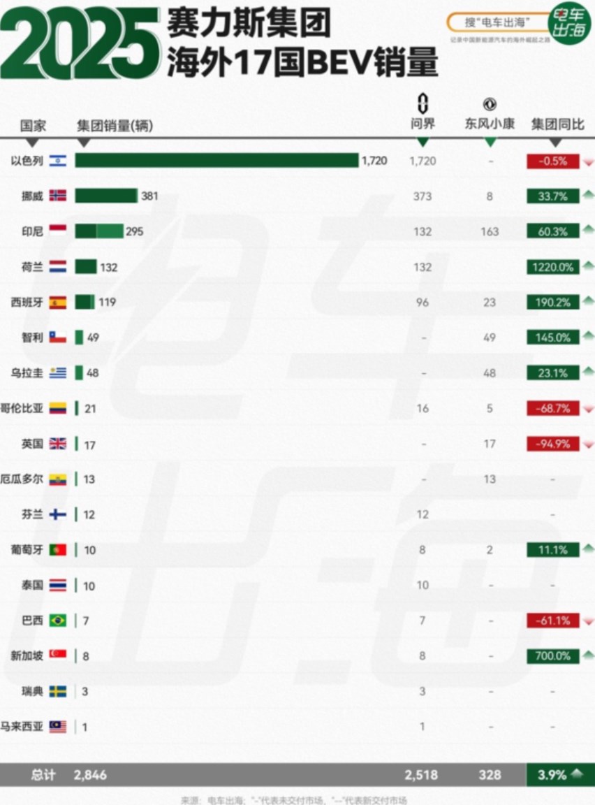 近日,有汽车媒体整理并公布了2025年度赛力斯集团在海外17国的BEV汽车销量情况。