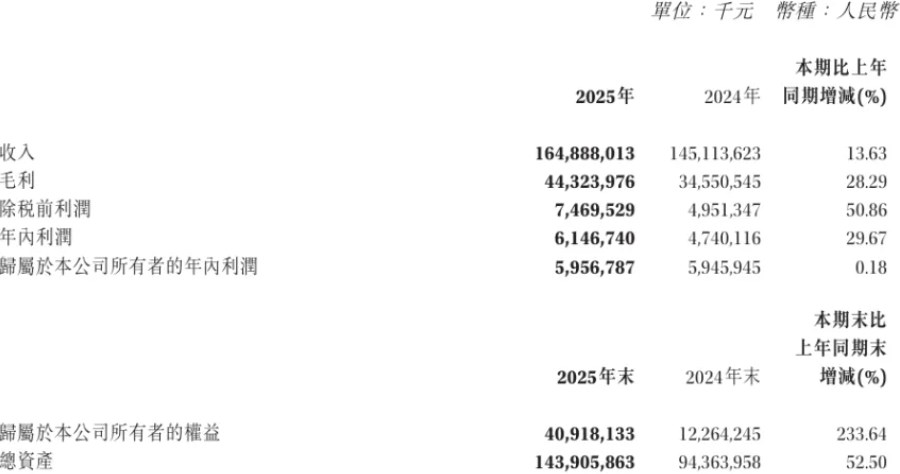 近日,赛力斯发布2025年度业绩,2025年全年营收1648.88亿元,同比增长13.63%;毛利443.24亿元,同比增长28.29%;除税前利润约74.7亿元,同比增长50.86%;归属于公司所有者的年内利润约59.57亿元,同比增长0.18%。